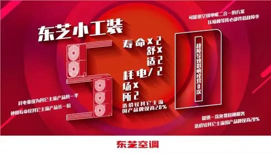 针对CCS小工装市场,东芝空调推出了拳头产品“灵动系列”,该产品室外机采用超薄机身的侧出风设计,很好解决了小工装项目外机摆放的痛点问题。此外,相对其它产品,东芝空调灵动系列还有“节能省心520”等优势,即寿命×2,耗电量÷2,舒适度×2,免费移机一次(二次安装)、价格仅比国产品牌贵20%、基本0故障。
