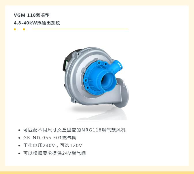 此次,我们将携紧凑型VGM 118系统和NRV 148系统亮相活动,通过风机与不同文丘里管、阀组的配合,可达到优异的空气燃气混合比,实现更高的燃烧效率,从而使现代供暖变得更强大、更经济和更环保。欢迎亲临现场共同交流。