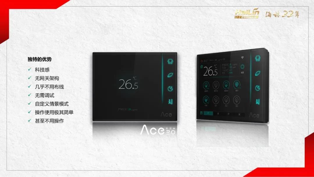 海林Ace2.0全环境智能控制器,是一款可以重新定义未来智控的黑科技产品,整合了空调控制、采暖控制、新风控制、灯光控制、窗帘控制及空气质量监测、温度监测、能耗监测等功能于一身,可实现触摸、智能语音、人体感应、APP等多种交互方式;Ace2.0采用无网关架构,不用布线、无需调试,操作极其简单;一个面板融合房间所有开关,可集成多种智能家居,极大程度简化生活。