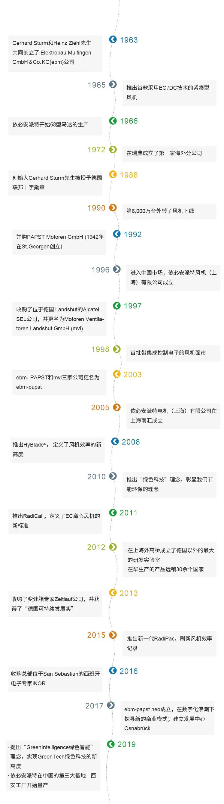 依必安派特由Gerhard Sturm先生于1963年10月成立,推出了一款新品——紧凑型60电机。该产品将外转子电机完全集成到叶轮中,形成了一个紧凑的单元。由于当时市面上销售的普遍都是大型电机,所以这款小型电机的市场反响非常强烈,很快被用于空间受限的各类应用中,从抽油烟机等大型家用电器到施华蔻吹风机。