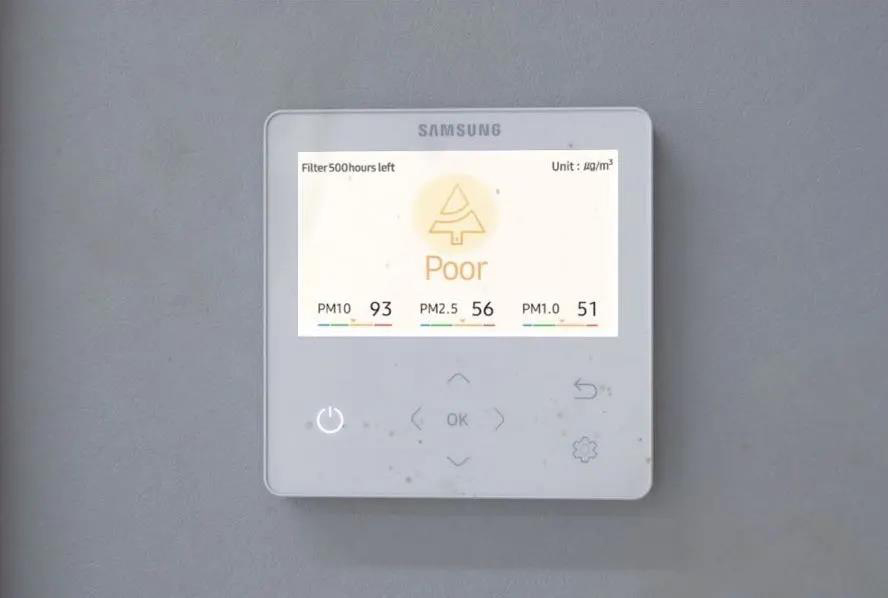 三星彩晶线控器为生活增添色彩的同时,对面板显示与智能控制功能做出了提升,流动彩色显示屏不仅能直观简明的查看温度,配合导航键操控想要的功能,IAQ数据显示设计详细传达当前空气质量指数(PM2.5/PM10)。