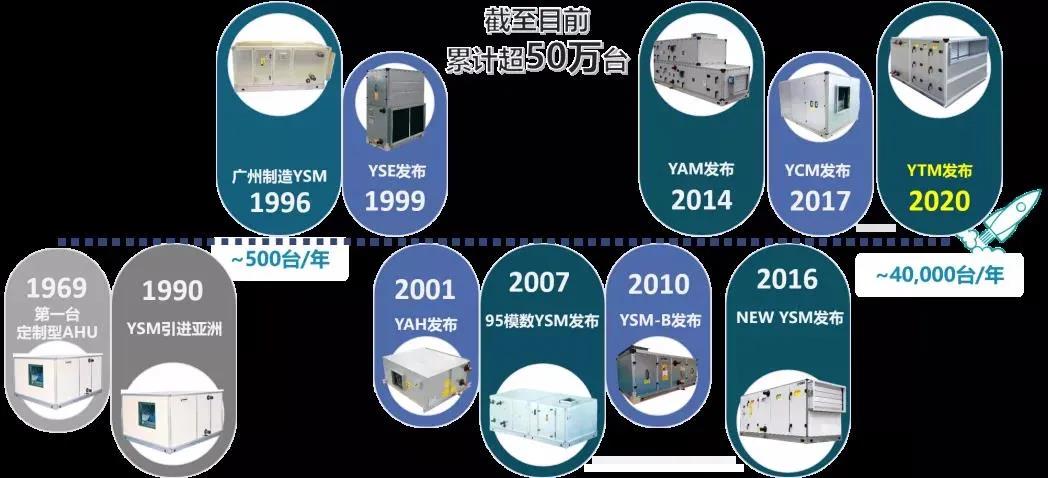 自1969年起,江森自控旗下约克品牌就开始制造定制型空气处理机组。1990年,约克空气处理机组首次引进亚洲;1996年,约克YSM在广州工厂制造,开始实现本土化生产。其后,约克空气处理机组新品频出,并不断与时俱进,迭代升级,目前已拥有累积超过500,000台机组现场稳定运行的可靠经验,深受中国市场青睐。