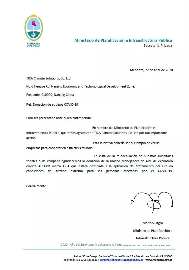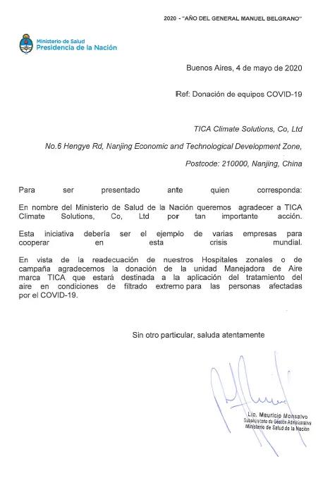 阿根廷政府将位于首都布宜诺斯艾利斯的Posadas National Hospital紧急整改为收纳感染患者的医院,合计1500张中级和重症监护病床。天加联合当地团队,为阿根廷卫生局分享抗疫经验,并提供专业医用设备用于该医院隔离病房,阿根廷政府此次安排飞机空运天加设备赶往项目现场。