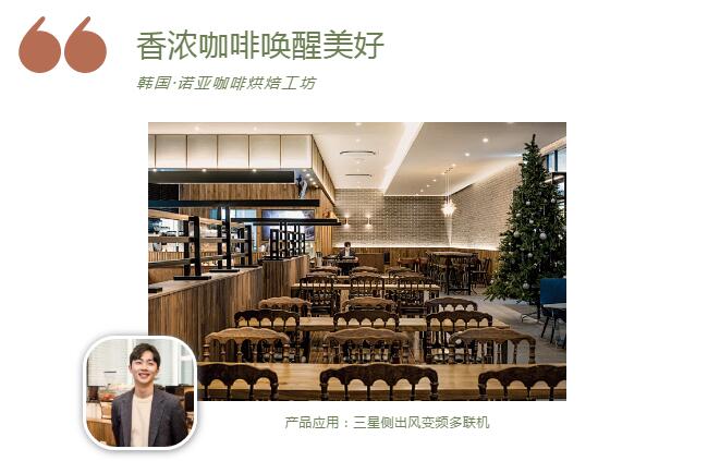 诺亚咖啡烘焙工坊非常重视店内环境舒适度的问题,三星侧出风变频多联机摆放灵活、高效稳定,360变频嵌入式产品空气百叶环绕送风,让不同位子上的顾客享受到同样的温馨舒适,Samsung WindFree™沐风嵌入式单向气流产品万千微孔设计,让冷风经过小孔轻柔的送入房间,改善冷风吹凉菜品的尴尬。