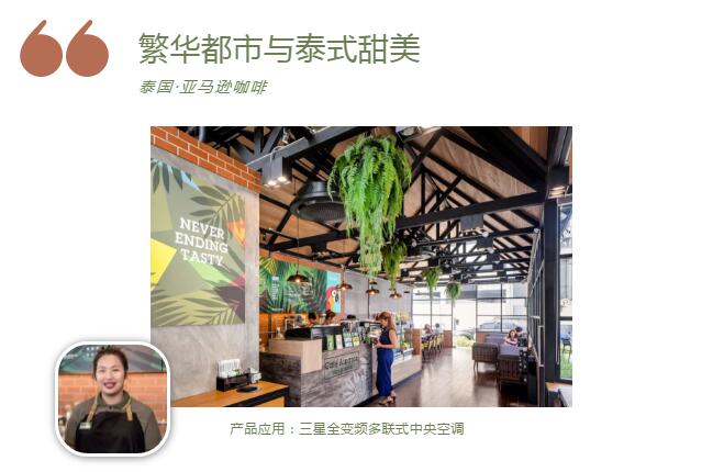 亚马逊咖啡是泰国最大的咖啡连锁店,以亚马逊雨林为特色主题打造自然清新的风格, 360变频嵌入式产品为店面舒适度加分,用轻柔的风环绕整个空间,三星全变频多联式中央空调高效稳定加强制冷动力,无惧客流高峰保持店内舒适。