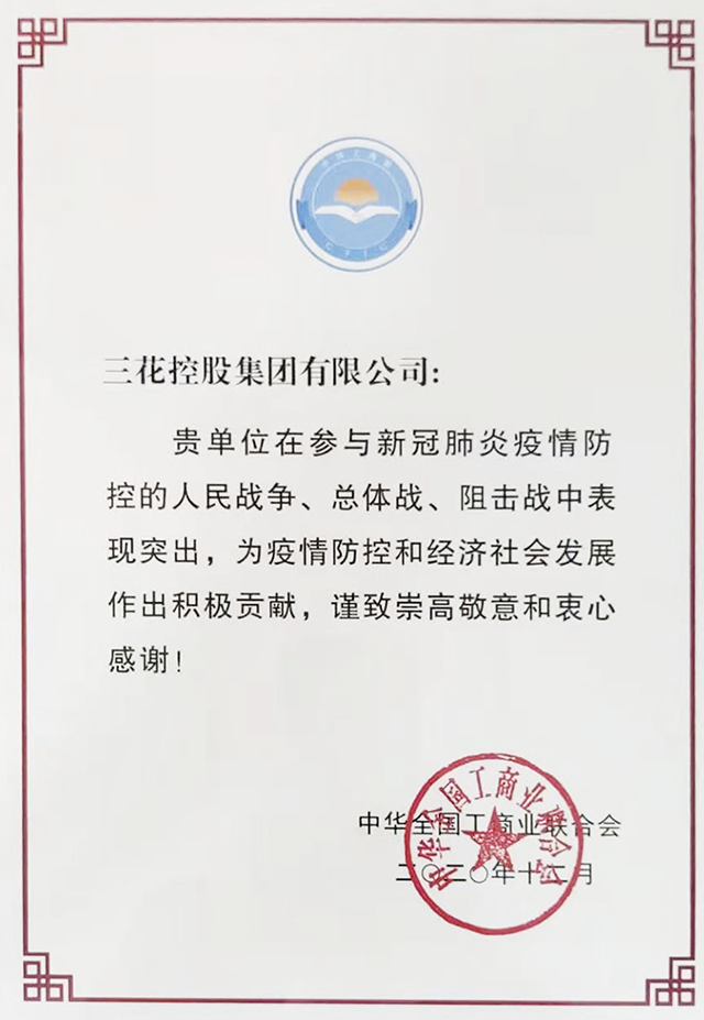 近日,中华全国工商业联合会公布了抗击新冠肺炎疫情先进民营企业表扬名单,三花控股集团荣获“抗击新冠肺炎疫情先进民营企业”。