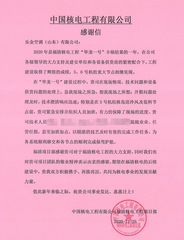 近日,LG收到一封来自中国核电工程有限公司的感谢信:感谢LG在现场物项、技术问题和设备供货问题的处理上急客户之所急,想客户之所想,以精湛的技艺及时有效的完成工作任务,为各系统顺利移交和各节点的顺利完成保驾护航。