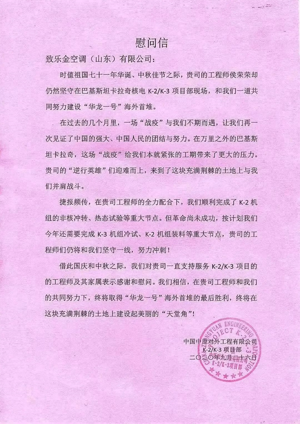 早在去年10月份,LG也收到一封来自巴基斯坦核电站的感谢信,华龙一号海外首堆在双方的合作下顺利完成了机组的非核冲转、热态试验等重大节点。卡拉奇2号核电机组是继福建福清5号机组之后全球第二个开建的华龙一号核电项目,意味着华龙一号首次走出国门,正式落地巴基斯坦,海内外将同步推进华龙一号示范堆的建设。LG中央空调在项目后期的调试中仍会与客户坚守阵线,共同促进最后的胜利。