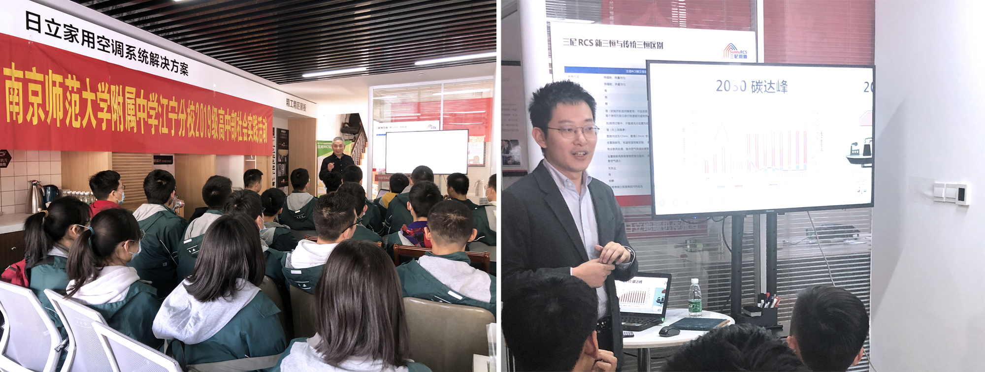 2021年2月21日是今年寒假的最后一天,南师附中江宁分校高中二年级东大基地班的同学们来到了位于南京市江宁区双龙大道上的“日立变频中央空调旗舰店”参观学习,并在南京三尼电器设备有限公司和青岛海信日立空调系统有限公司专业人士的指导下,进行了一场别开生面的专项社会实践活动,整个过程气氛热烈、高涨,内容丰富、生动,取得了圆满的效果。