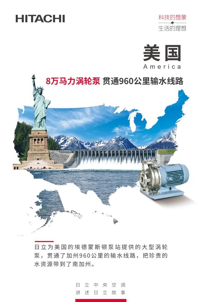 美国南加州阳光明媚、气候宜人,但却存在着水资源严重匮乏的现象。为了解决南加州用水难的问题,日立提供了八万马力涡轮机,把丰富的水资源带到南加州。