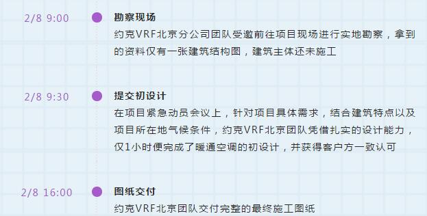 2月8日最终设计方案敲定起,约克VRF北京分公司就启动前签订合同紧急流程,并在公司各部门领导全力配合下,排除万难,为整个项目抢工赢得了宝贵的时间,从排产到抵达项目现场仅用时不到2天!