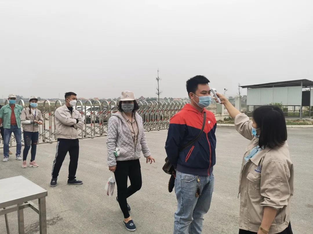 2月17日,正月初六,越南三花迎来艰难复工第一天。然而,越南当地疫情严峻,公司所在的海防市周边一带被列入疫区,疫区人员不得进入海防,这给公司复工带来了极大的难度。公司积极执行政府联防联控政策,以第一时间实现复工复产作为公司的第一目标。春节期间,中方干部全部留越过年。开工第一天,公司管理人员就早早来到公司,维持员工入厂秩序;排队消毒、核实身份、测量体温和发放开门红包等工作有序开展;各条生产线正常启动中。通过前期的策划,办公室人员到岗率达100%,生产一线员工到岗率达到60%。