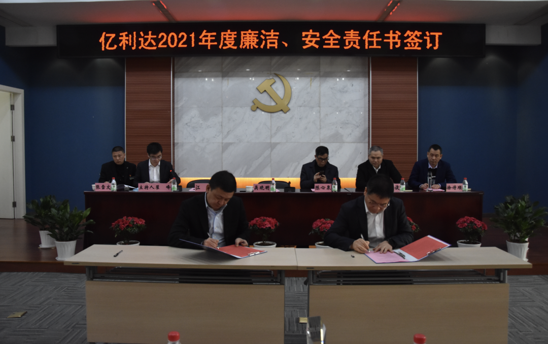 大会首先举行了表彰仪式,董事会秘书翟峰宣读了亿利达党委关于表彰2020年度公司先进集体、先进个人的决定,随后吴董等公司领导为先进集体和先进个人代表颁奖。颁奖结束后,公司工会主席陈雅、科技工会主席王丹为2020年度困难职工发放了工会帮扶慰问金。随后在会上举行了廉洁、安全责任书的签订仪式,吴董与成员公司负责人签订了廉洁、安全责任书。