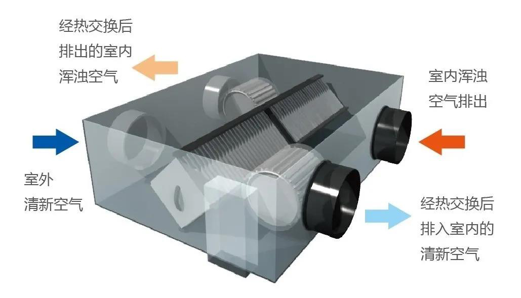 全热交换器以风扇电机为动力源,以换热核心为基础,当室内排风与室外新风交叉通过设备时,实现全热交换。
