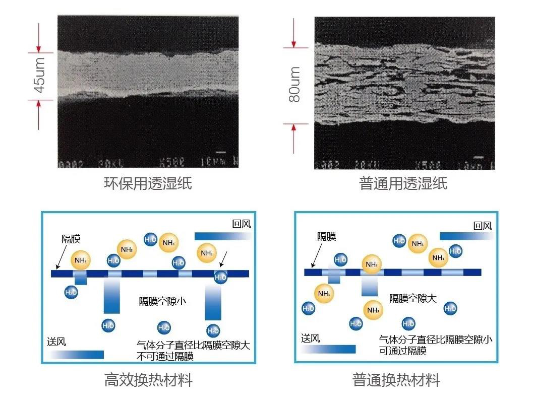 热交换芯采用特殊的无孔薄膜纸,这种材料具有厚度小、透湿率高、气密性好、抗撕裂、耐老化的特点,这样既能很好地进行温度和湿度的交换,又彻底避免污染物质向新风渗透。