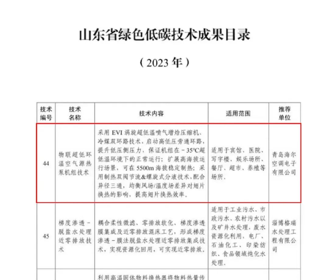 近日,山东省科学技术厅和生态环境厅共同公布了《2023年山东省绿色低碳技术成果目录》,来自水治理、大气治理、碳减排等领域共78项先进技术成果入选。其中,海尔智慧楼宇凭借“物联超低环温空气源热泵机组技术”入选目录,获得省级推荐。