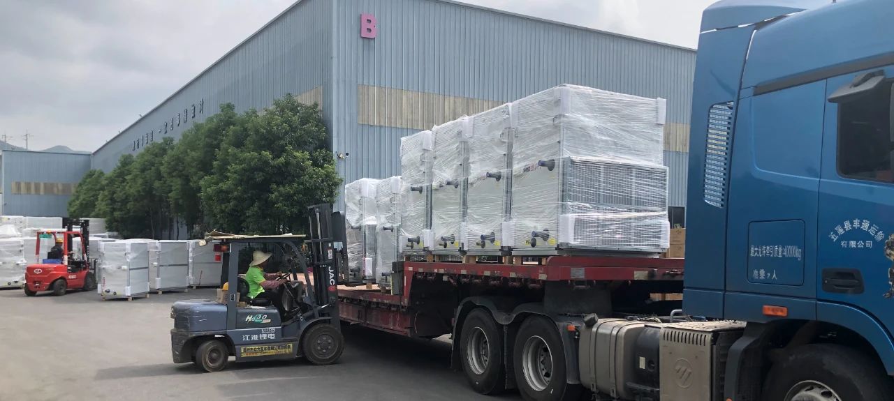 工厂内,一排排机器飞速运转、数条流水线紧张运作、叉车来回穿梭、工友们加班加点,一批又一批空调走下生产线。工厂外,多辆货运车正停在门口等待装车发货,现场一派繁忙景象。