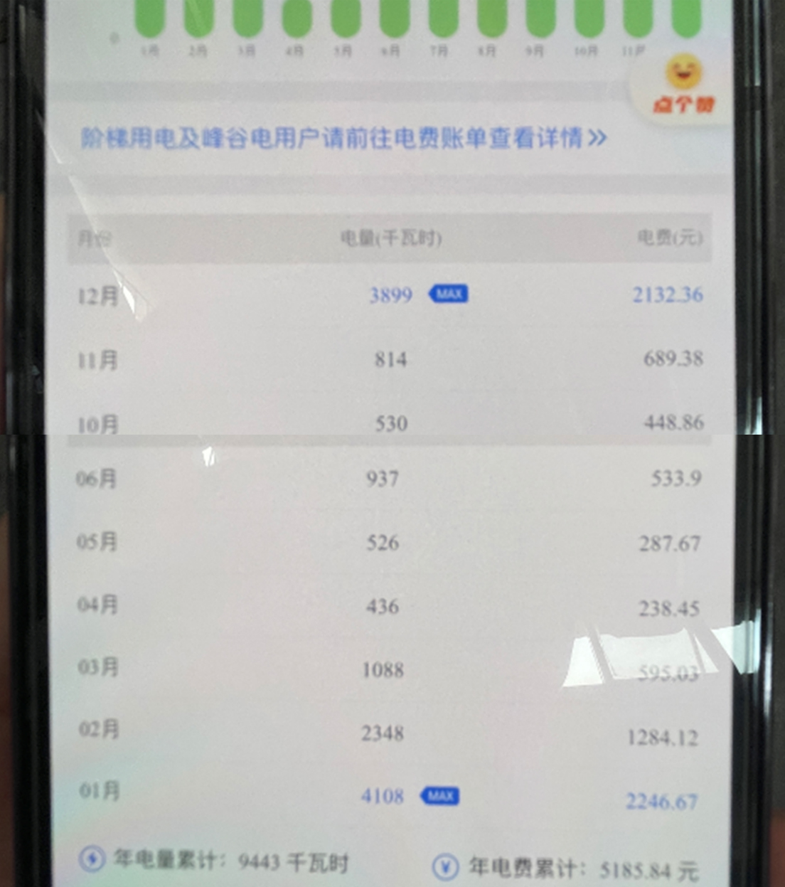根据用户手机缴费记录,采暖期4个月的耗电量约为11250度,电费总量不到7000元,其中11月份由于申报时间的原因,平均电价约0.85元/度,其余时间点的电价均为0.5469元/度。除去生活用电,空气能采暖的成本在5800元左右。