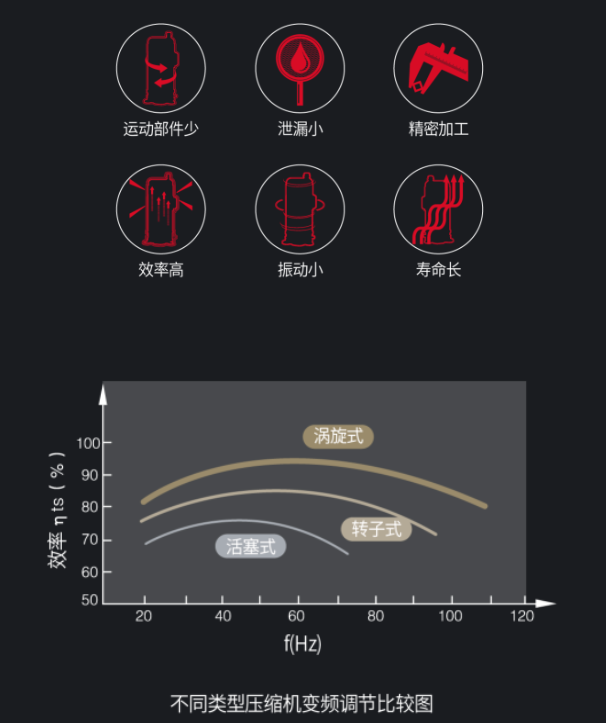日立压缩机的不对称涡盘结构,相对传统对称旋涡技术具有:泄漏少,效率高;相邻两室压力差小,振动小,更静音;防止过压缩,压缩机使用寿命长等突出特点。