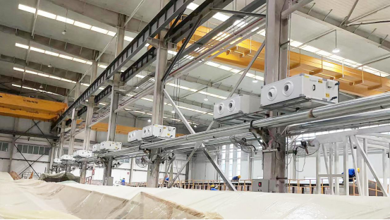 作为国内风电叶片生产龙头,中材科技背靠南玻院、北玻院与苏金所三大国家级科研院所四十多年的核心技术资源,实现了强大的新材料原材料研发供应,产品开发从1.0MW往7.0MW系列化推进,现拥有六大系列60余个型号产品,应用环境涵盖高低温、高海拔、低风速、沿海、海上等,全系列产品通过GL、DNV等国际认证。近年,中材科技在巴西巴伊亚州建立了海外第一家的风电叶片工厂,成为其全球化布局的标志性节点项目。然而,要生产出高质量的风电叶片,需要解决许多工艺和环境控制问题,其中如何确保工作环境的舒适性及实现节能减排,更是选配车间设备的关键挑战。