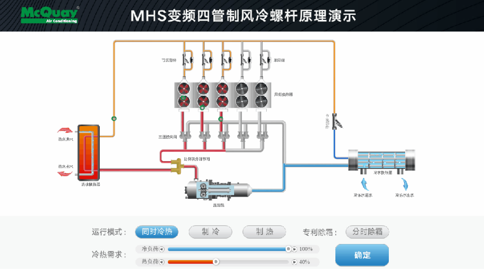 麦克维尔全新推出变频四管制风冷螺杆机组,为保障机组水温控制更精准,结合压缩机变频调节和冷媒智能分配技术,创新地实现“零断点”水温控制。