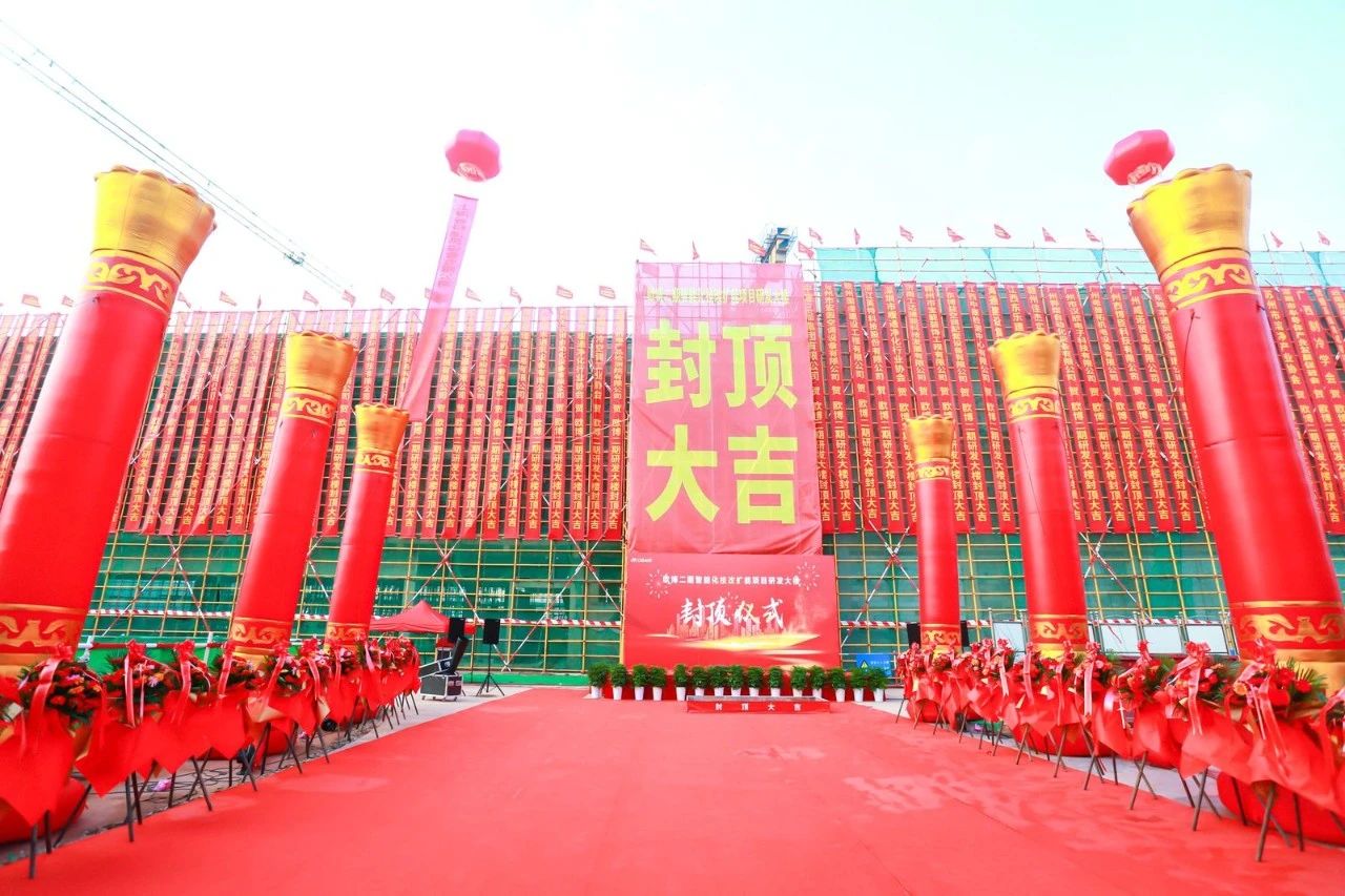 伴随着激扬的乐曲、震天的礼炮、缤纷的彩烟和热烈的掌声,欧博二期研发大楼正式封顶。