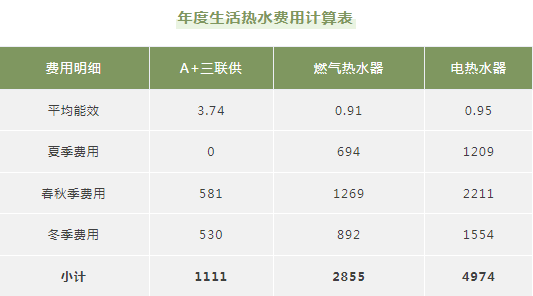 注:①采用A+热回收10HP机组,6口之家,春秋热水量43m3/年、夏冬热水量100 m3/年,进行计算;