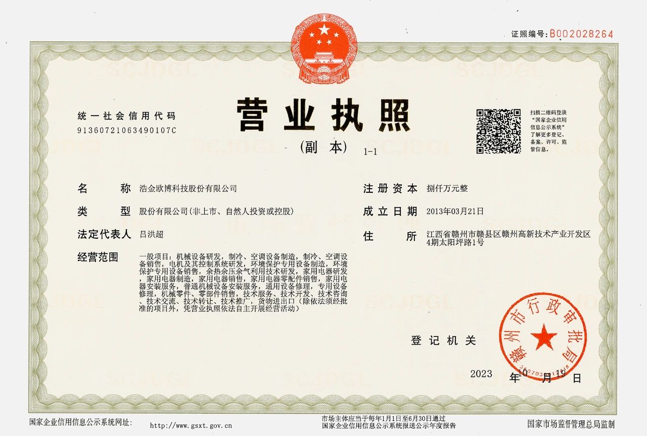 为实现公司战略目标,满足公司规模化的发展要求。2023年10月19日,江西浩金欧博环境科技有限公司正式更名为“浩金欧博科技股份有限公司”,完成了从“有限公司”整体变更为“股份有限公司”的工商变更登记备案手续。