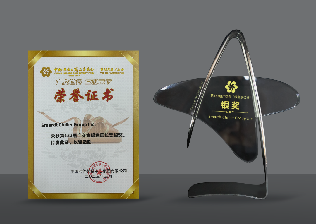天加携旗下磁悬浮中央空调品牌SMARDT参加第133届广交会,参展展台荣获“绿色展位银奖”。