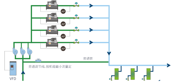 冷冻水系统采用一次泵变流量系统,供/回水温度6/13℃,7℃大温差设计使得水流量大幅度降低,水泵扬程降低,有利于降低水泵初投资和运行能耗。水泵和冷机采用集管连接,可互为备用增加系统可靠性,同时在运行阶段可通过水泵运行台数优化来提升冷冻机房整体能效。一次泵变流量系统对冷机蒸发侧变流量下限要求较高,特灵冷机针对此情况适应能力较强且冷冻水变流量运行时对冷机能效影响很小,可将一次泵变流量水系统优势充分的发挥出来。