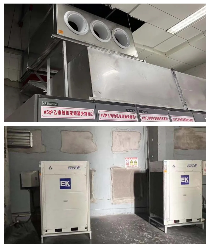 EK工业空调的技术团队对现场进行详细的测绘后,设计热风管道,将高压变频器的热风引入直膨射流机组进行冷却。室外热风道设应急排风阀,当冷却装置故障时可迅速将热风排入大气,从而实现了高效的散热降温。