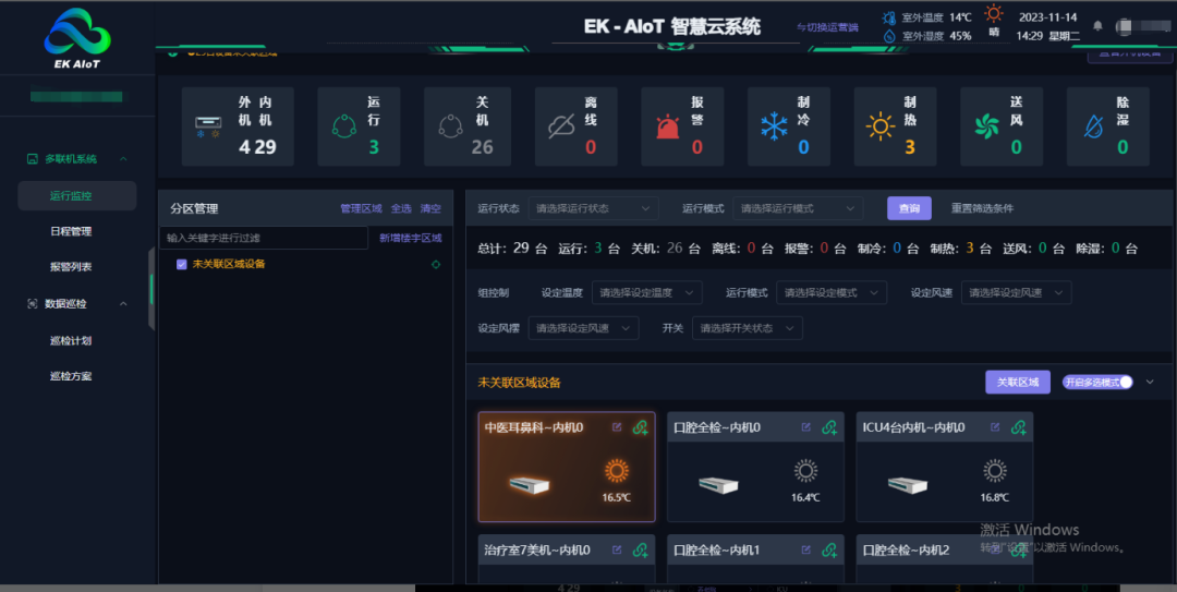 一键节能:依据EK智慧云多联后台大数据的分析结果,优化机组运行状态,一键节能控制,智能降低运行费用。