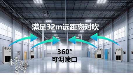 此外,还可选射流喷口送风,能够360°旋转调节出风方向,送风距离远,满足大空间的送风需求。可以解决像配电室发热量大,不能有水系统应用的降温需求。