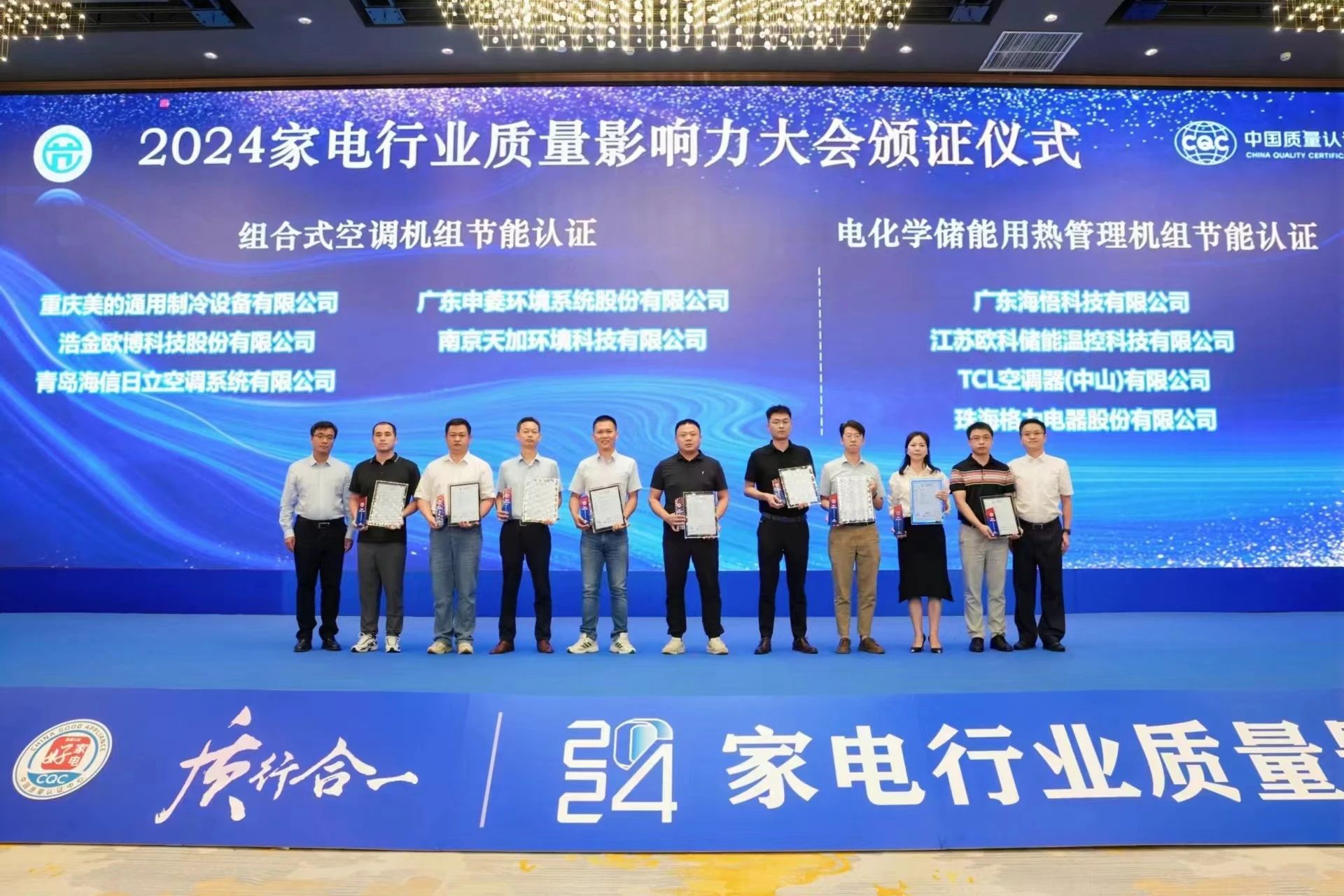在2024家电行业质量影响力大会颁证仪式上,EK荣获电化学储能用热管理机组节能认证。