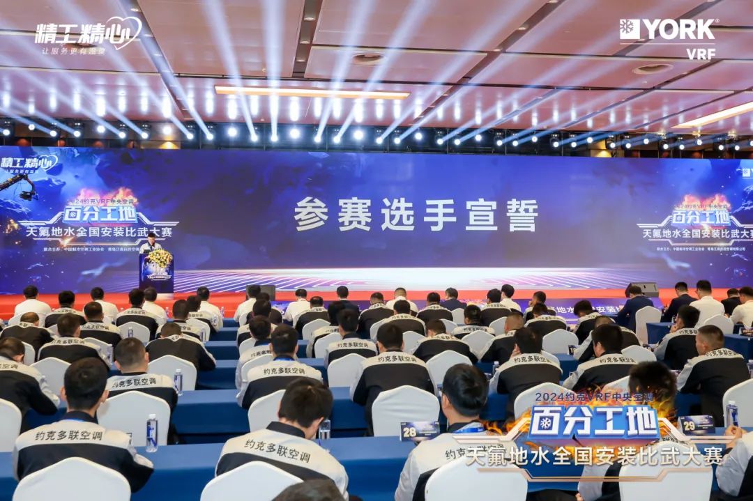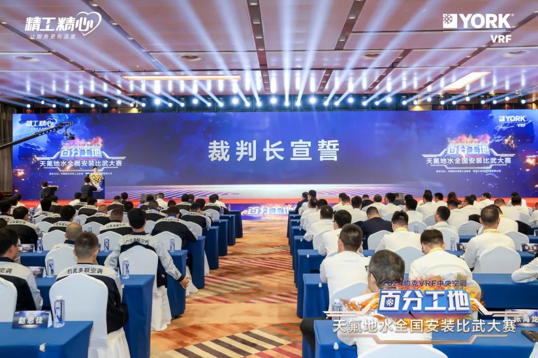 在裁判长与参赛选手代表分别上台宣誓,确保比赛的公平与公正后,随着各位领导按下启动键,2024年约克VRF中央空调“百分工地”天氟地水全国安装比武大赛正式开启。