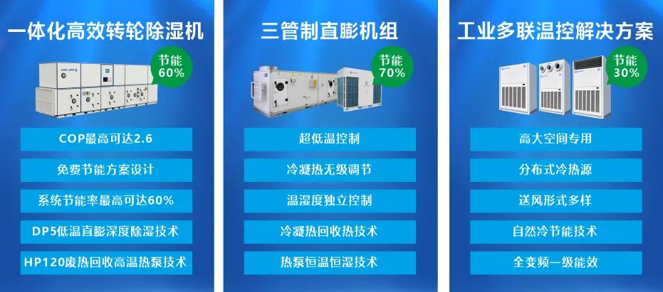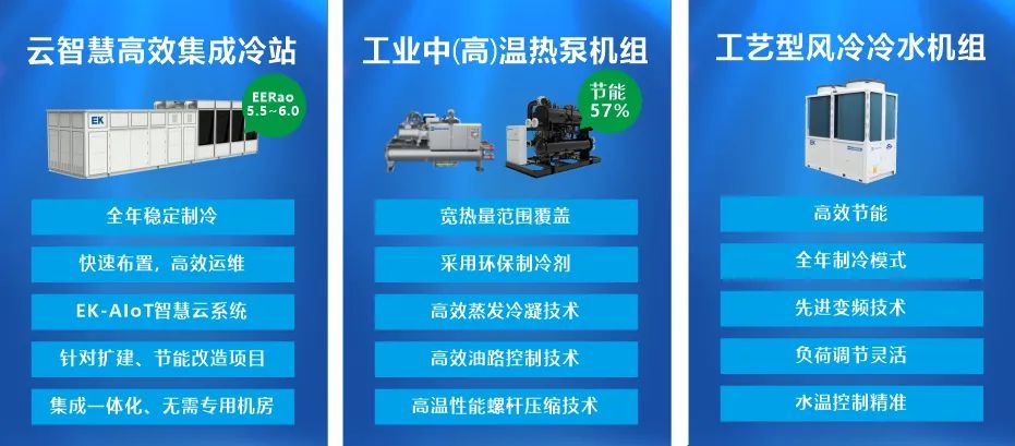 在本次展会现场,EK工业空调重点展示一体化高效转轮除湿机、三管制直膨机组、工业多联温控解决方案、云智慧高效集成冷站、工业中(高)温热泵机组、工艺型风冷冷水机组等一系列核心节能产品和系统方案,全力支持各行业客户在全球低碳节能环保的大背景下实现降本增效。