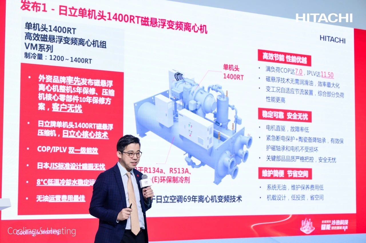 江森自控日立空调集团中国和东南亚及太平洋大区解决方案及服务事业部总经理兼江森自控日立万宝空调(广州)有限公司总经理张振军从日立空调的发展时间轴出发,介绍了本次发布的日立单机头1400RT磁悬浮变频离心机在噪音、可靠性及性能品质等方面的综合优势。同时,本次活动还发布了“磁悬浮离心机厂家整机5年保修、压缩机核心零部件10年保修”方案,展现出产品品质的优异性及产品生产方的品牌责任。