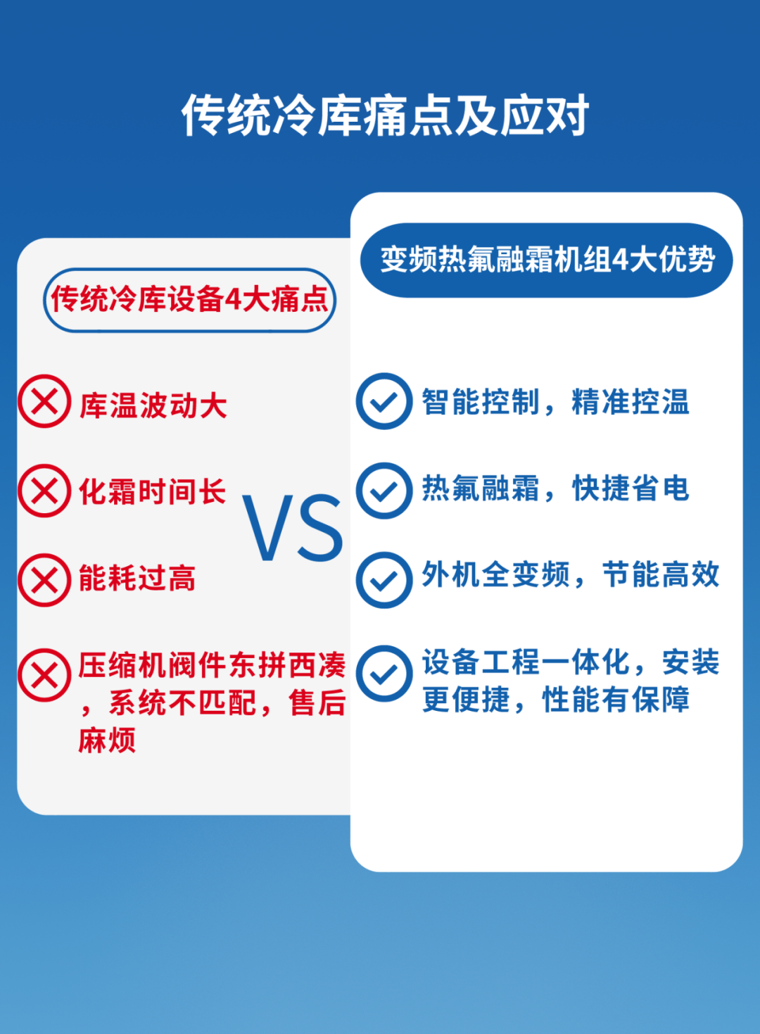 变频热氟融霜冷冻冷藏套机在实际应用中表现优异,经项目实测显示,相较定频技术该机组节能24%,融霜速度提升50%,库温恢复速度提升43%,*库温更稳定,应用更节能。