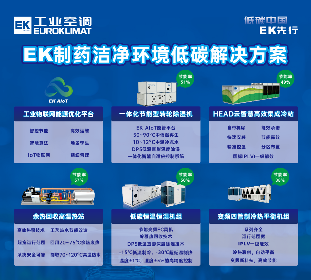作为制药行业的空气处理专家,EK工业空调始终聚焦行业实际需求,打造覆盖工业冷热源、工业高温热泵、工业环境控制及工业氟系统等多领域的节能产品矩阵,包括HEAD高效集成冷站、四管制冷热平衡机、60~80℃中温热泵机组、80~120℃高温热泵机组、三管制恒温恒湿机、一体化高效转轮除湿机、EC风机墙、工业多联系列等绿色产品与系统方案。同时,依托EK工业空调自主研发的EK-AIoT工业物联网能源优化平台,实现对设备状态的智能监控与云端运维,为制药企业提供高效、低碳、可靠的温环境系统解决方案,切实帮助药企实现节能降耗与绿色运营。