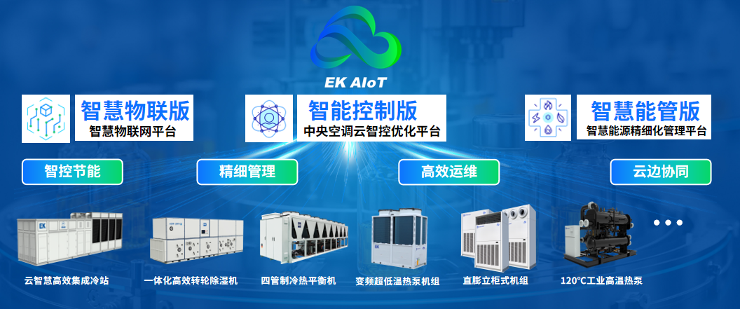 作为一套从感知端,边缘端,平台端全链路智能化控制解决方案,EK-AIoT中央空调"云+边"智控解决方案可针对不同场景提供数智化节能增效及数智化运维管理服务,充分挖掘应用场景的节能价值及管理价值。