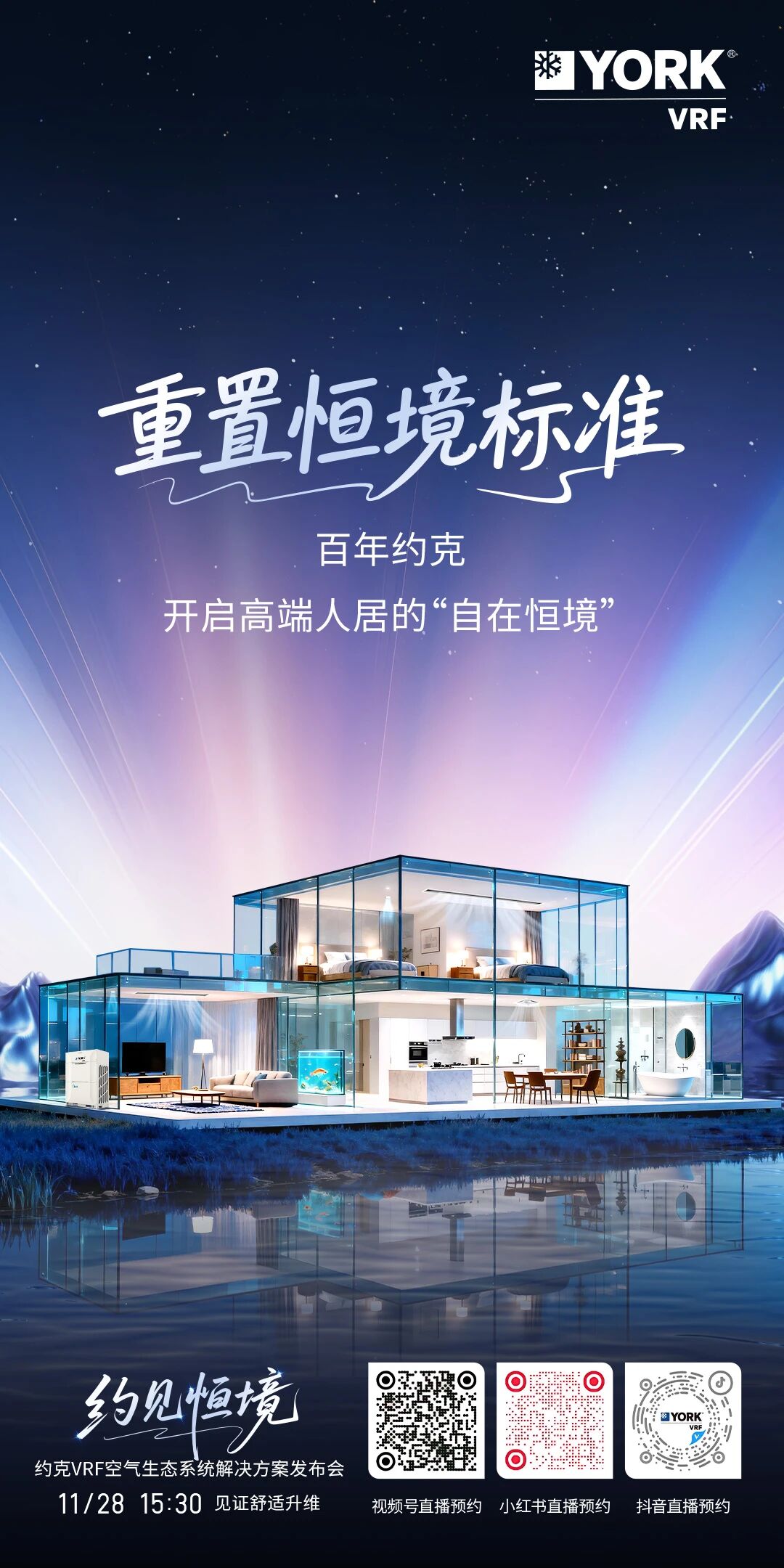 约见恒境,共启新篇。11月28日15:30,诚邀您共聚约克VRF空气生态系统解决方案发布会,一同启幕理想空气的升维时刻,共鉴恒境生活的全新答案。
