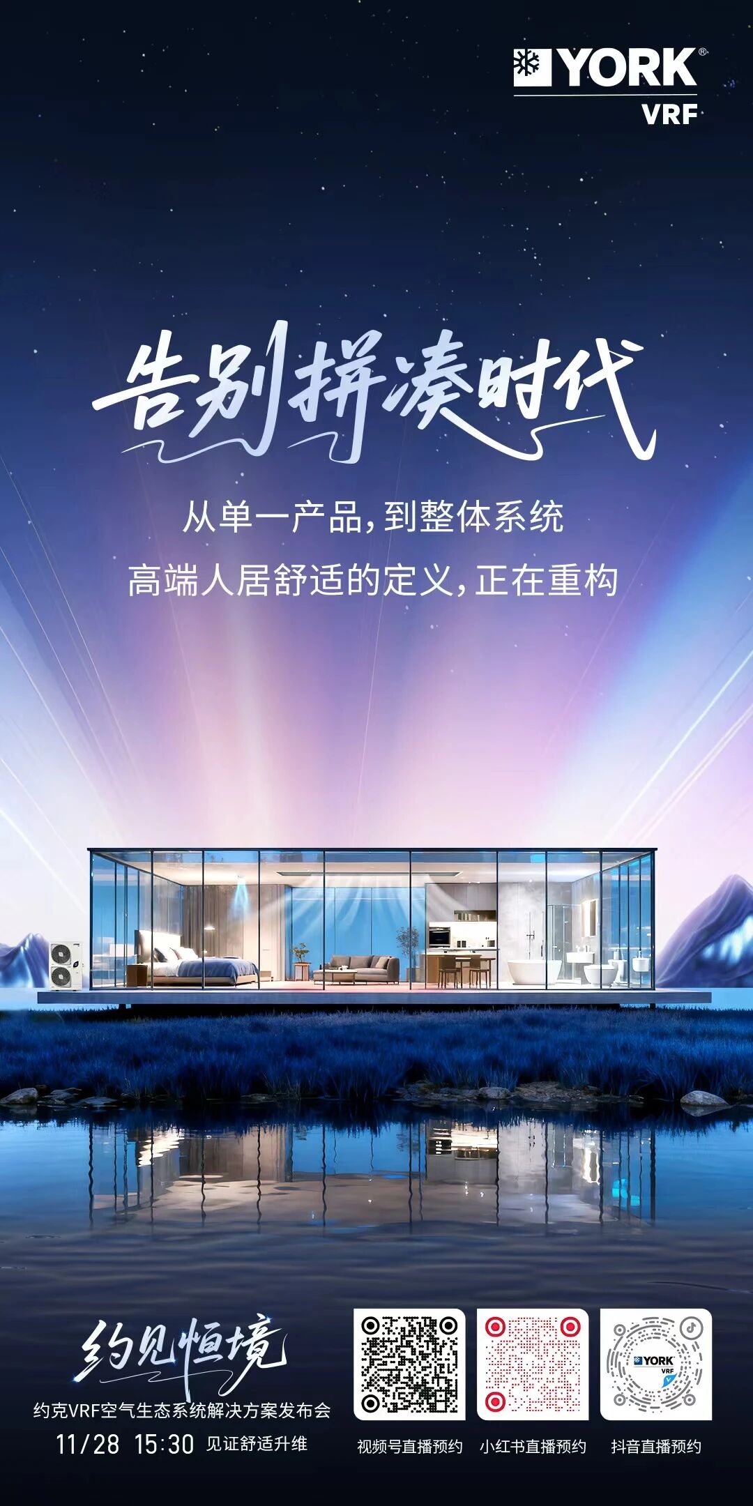 回应品质生活向往,约克VRF中央空调传承百年匠心而持续创新,缔造契合高端人居的自在恒境。11月28日,“约克VRF空气生态系统解决方案发布会”即将开启,从单一产品到整体系统,从一度温差的执着到六维九恒的舒适掌控,全面重构恒境人居标准。