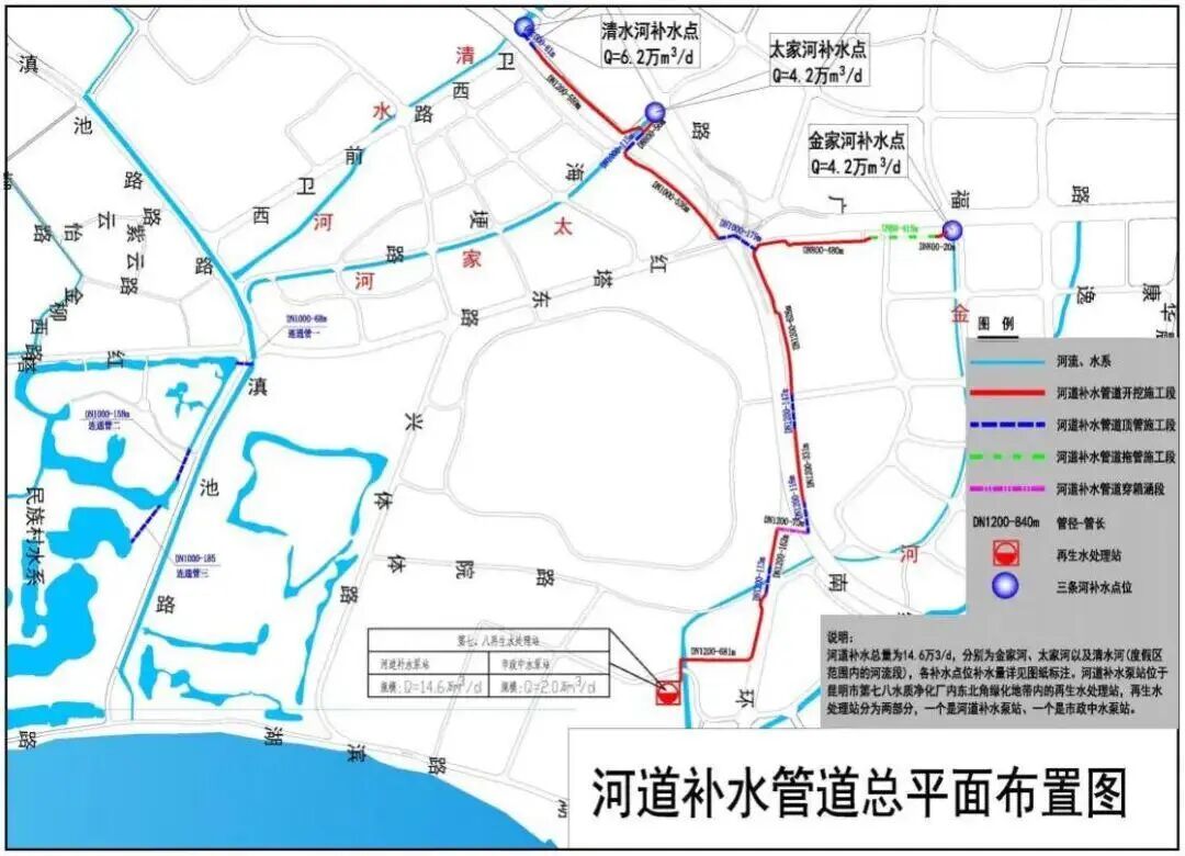 工程以昆明市第七、第八水质净化厂的达标再生水为水源,向太家河、金家河、清水河等河道实施生态补水。主要目标是增加水动力、改善水体流动性、增强水体自净功能,从而提升河道水质和人居生态环境。