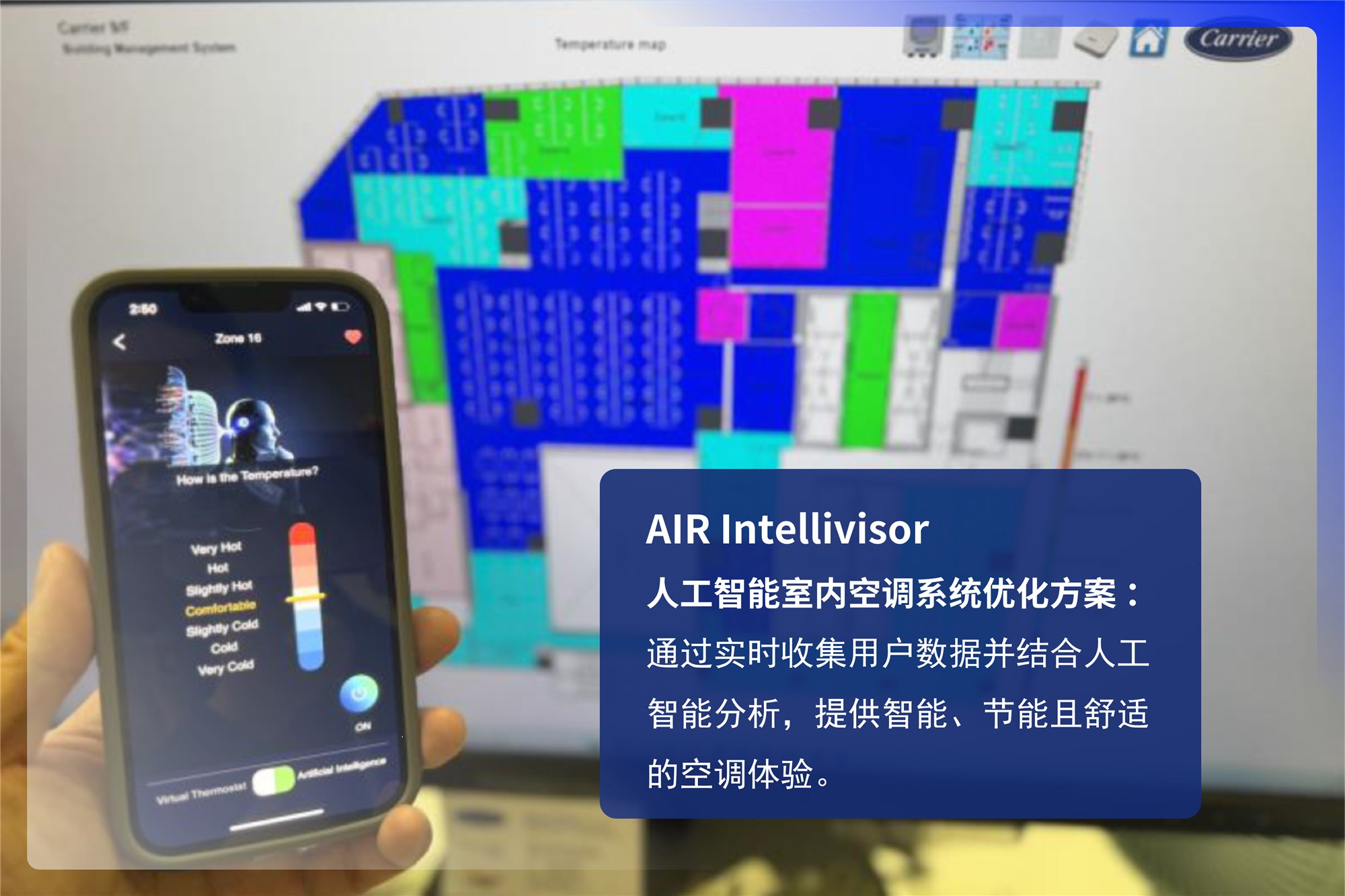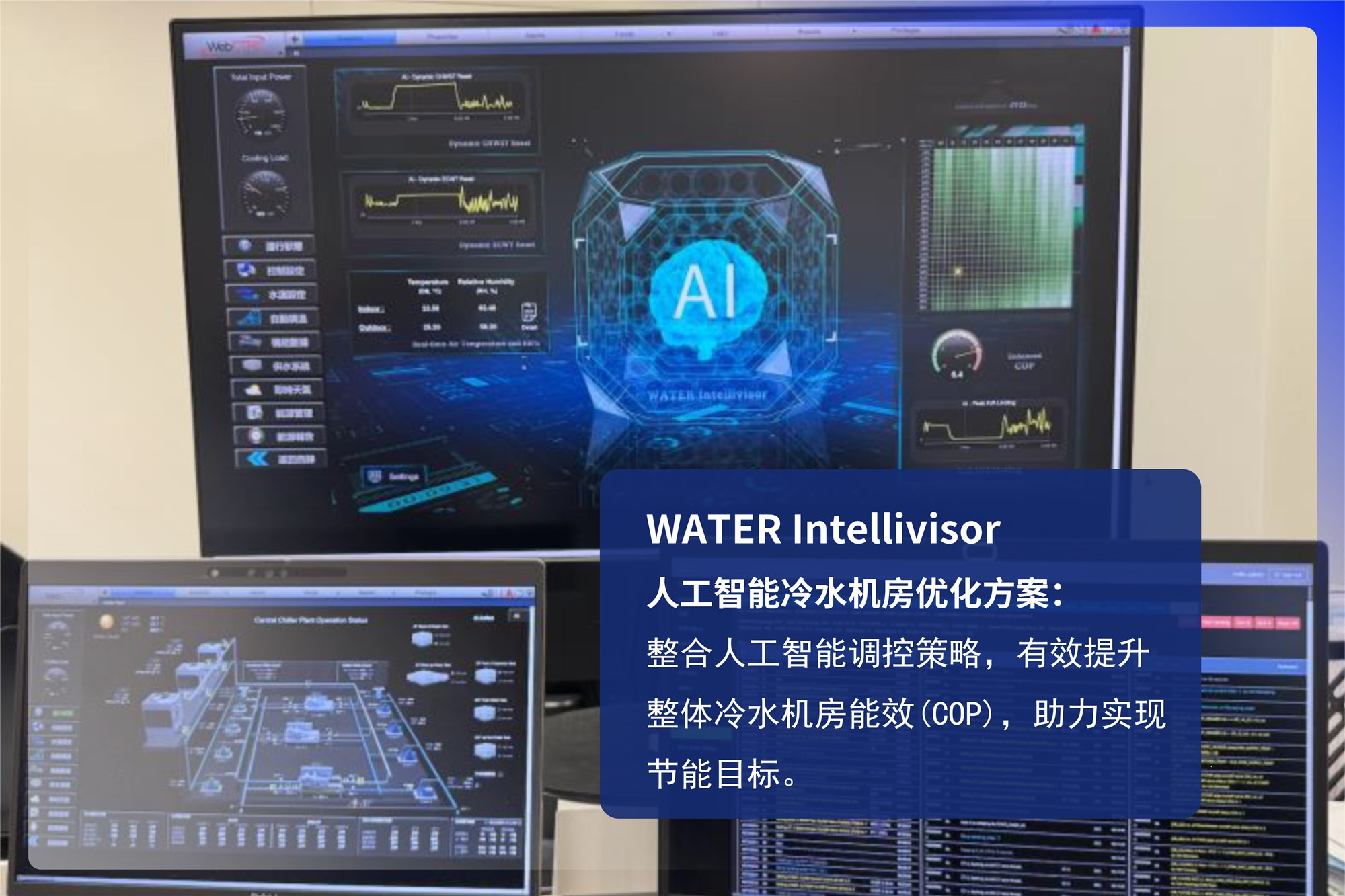 推出两项人工智能解决方案AIR Intellivisor(针对室內空调系统)和WATER Intellivisor(针对冷水机房系统),通过数据采集、智慧分析、动态优化等优势,实现能源管理智能化突破。