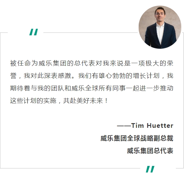 威乐集团监事会主席Lars Roßner先生补充道:“Oliver Hermes总裁在进一步发展公司的战略方向方面发挥了关键作用,同时我们也对Tim Huetter先生作为集团总代表在指导威乐增长战略方面的广泛专业知识充满了信心。”在这个岗位上,Tim Huetter向Oliver Hermes总裁兼全球首席执行官汇报。