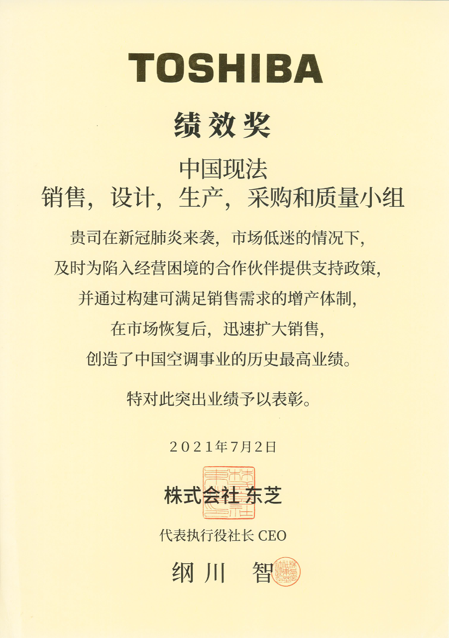 为表彰东芝空调中国事业部在2020年度的杰出表现,东芝集团授予东芝空调中国事业部2020年度东芝集团社长绩效奖。