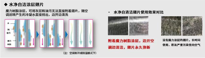 · 内机蒸发器翅片具有自清洁功能。这是一个无需额外开启的清洁功能,东芝采用独特的水净自洁涂层,在翅片上形成保护层,让灰尘油污无法直接附着,并随运转产生的冷凝水排出,实现时刻洗净。