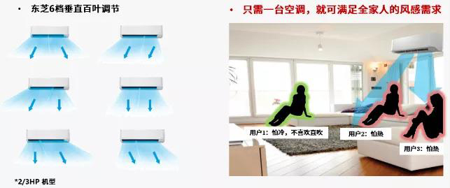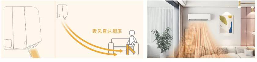 ②制热时,百叶水平角度可接近90°,配合强有力的风扇,可实现暖气直吹脚底,可享受地暖式的制热舒适体验。