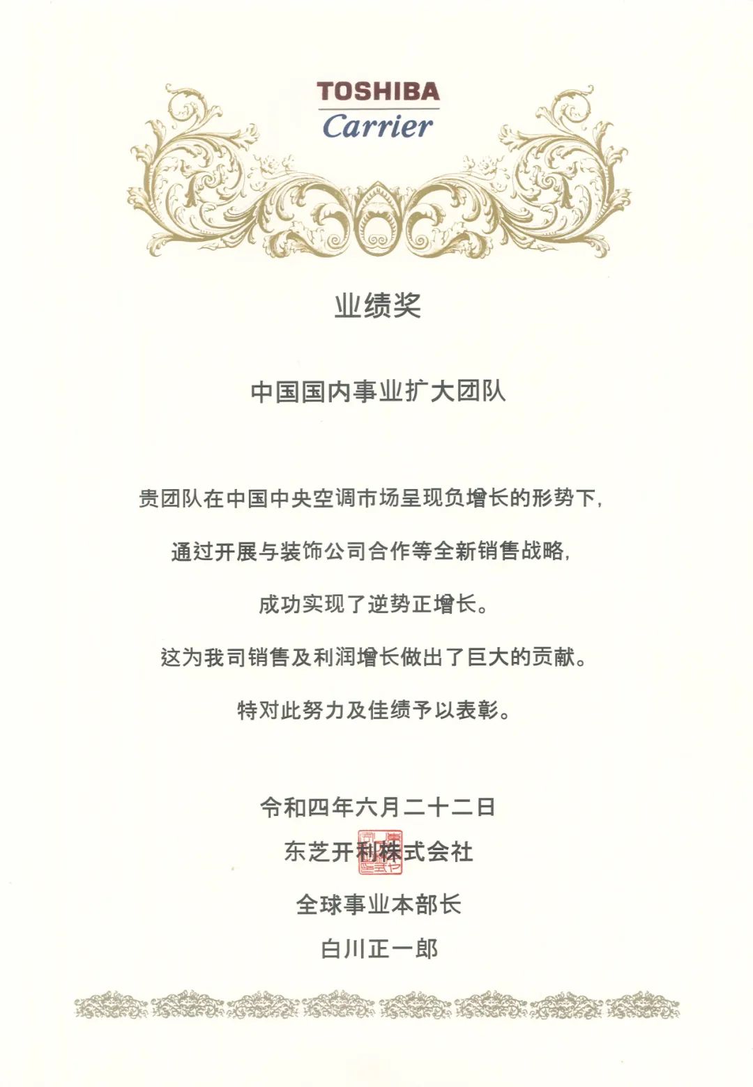 2022年6月22日,在距上次荣获集团社长绩效奖不到一年的时间内,东芝空调中国事业部凭借着优秀的销售业绩,再次得到集团的肯定,并被授予全球事业本部长奖。