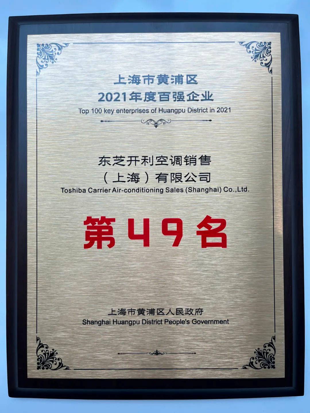 会议表彰了2021年度对黄浦区经济发展贡献突出的前100强企业,东芝开利空调销售(上海)有限公司跻身前五十名,在百强名单中列第49位。